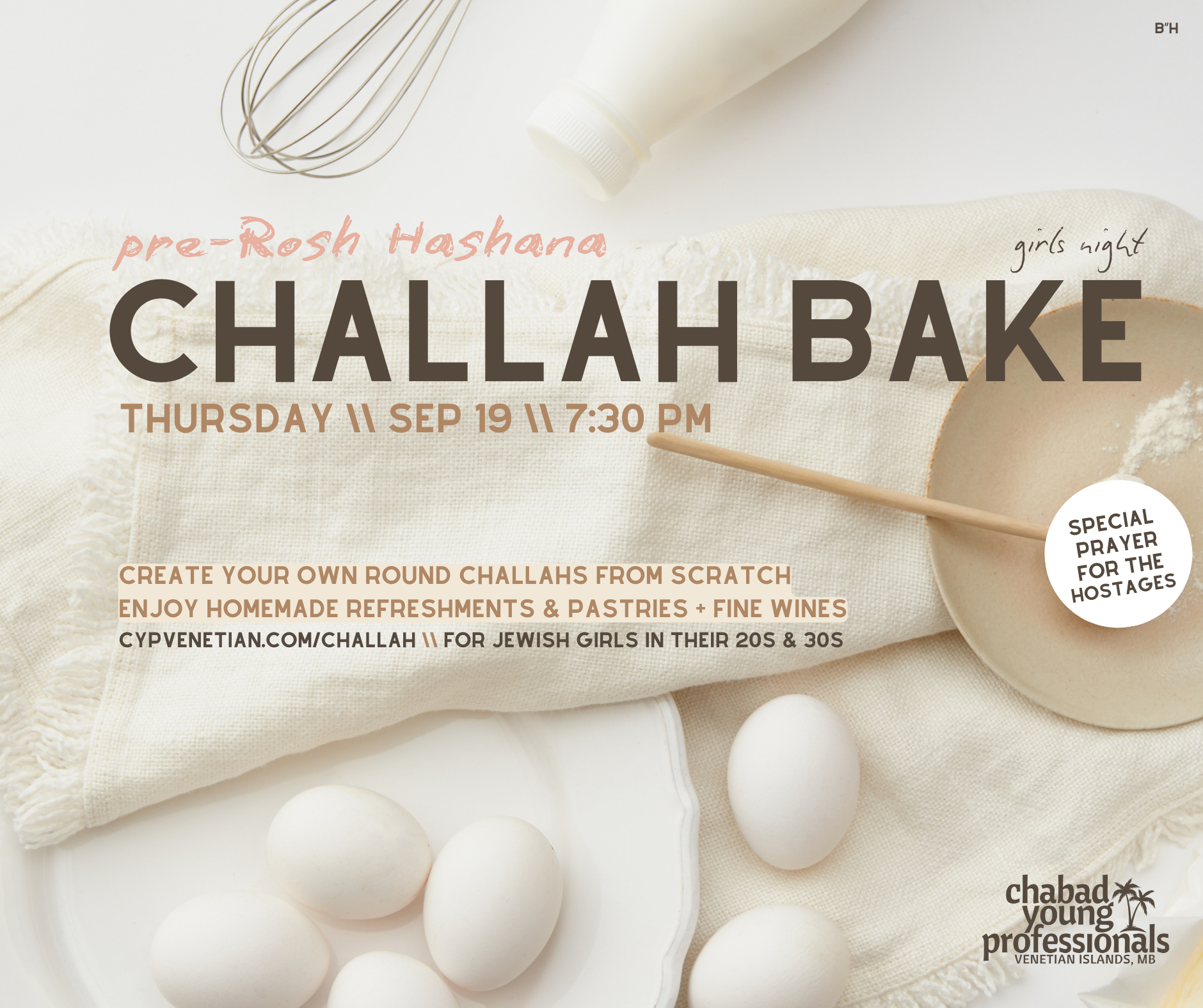 Get into the New Year vibe with fellow young professionals as we create our very own Rosh Hashana Challahs from scratch - from mixing the dough, to kneading, to shaping and topping.